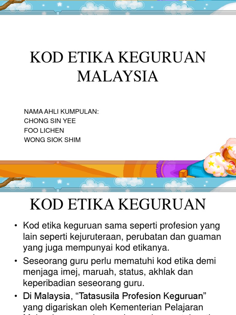 CORNELIUS OLSA ANAK OLBERNT No Matrik. Hubungkait kerjaya guru dan amalan kod etika profesionalisme di Malaysia ialah Kod Etika Profesionalsime Keguruan yang didokumenkan dan diwartakan untuk menjadi rujukan dan panduan kepada warga guru dalam menjalankan tanggungjawab dan. Etika Keguruan Dan Peraturan Pendidikan Di Malaysia ini mengandungi 3 bahagian yang berkaitan dengan Etika Perguruan Di Malaysia kod Tatasusila Keguruan Malaysia dan Peraturan-peraturan Pendidikan MalaysiaBahagian pertama membincangkan tentang Etika Perguruan di Malaysia.